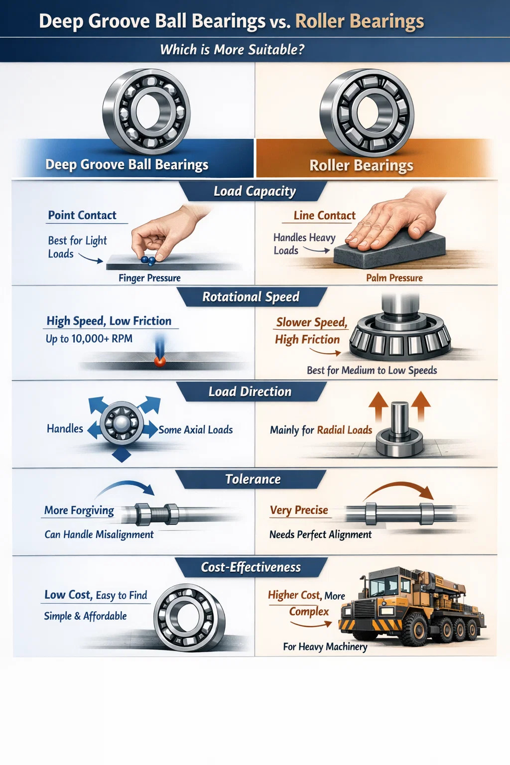 I en verden af lejer er der ikke noget absolut "hvilket er bedre", kun "hvilket er mere egnet." Dybe rille kuglelejer og rullelejer er som løbesko og vandrestøvler – hver har sine styrker.